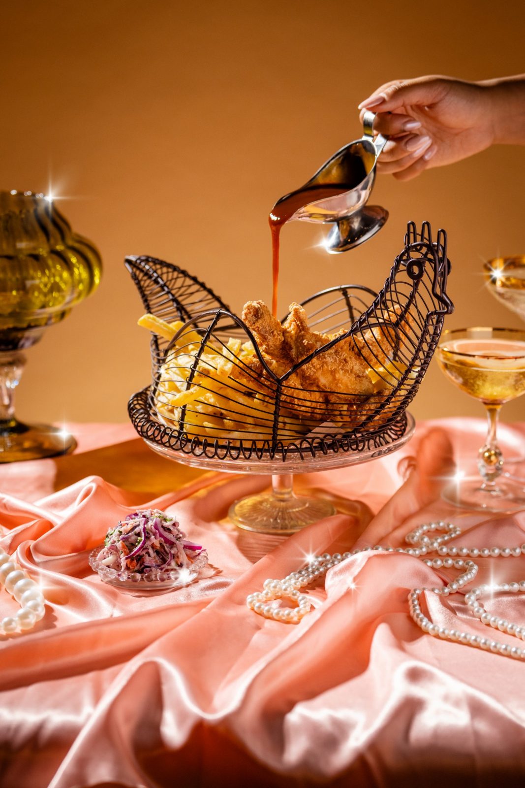 • Chicken in a Basket (£8): Crispy buttermilk chicken with golden fries, fresh slaw, and maple & bourbon BBQ glaze.